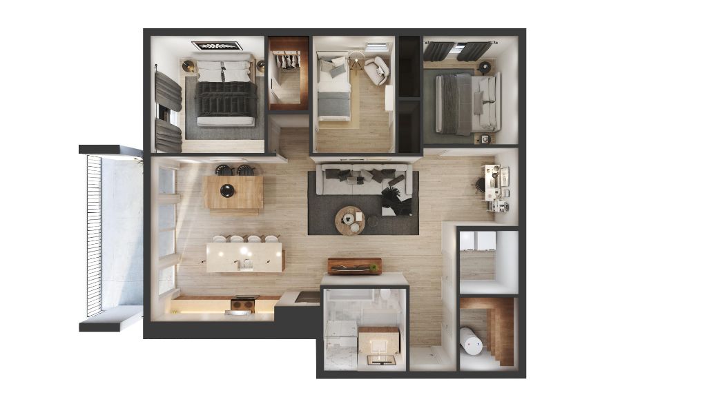 4 ½ | 2 Chambres | Coin bureau | Terrasse d’environ 125 et 145 pi² | Unité 303 | Garde-manger supplémentaire |